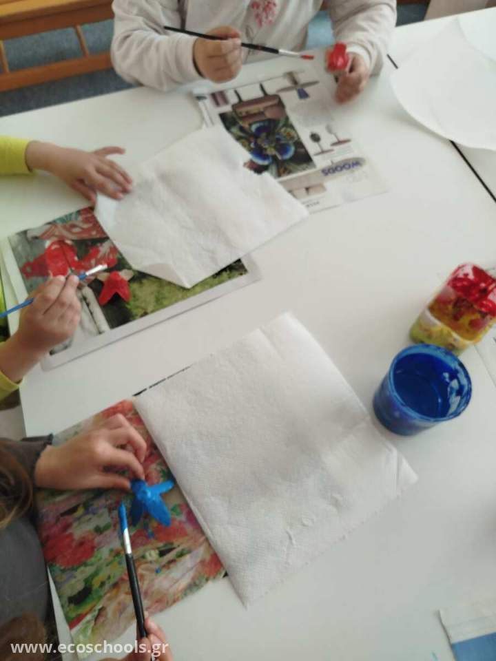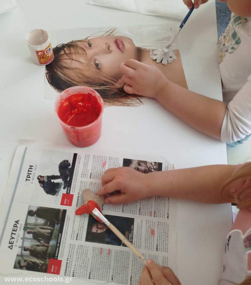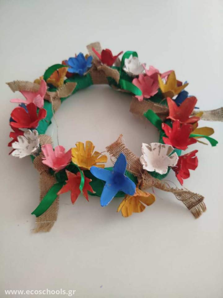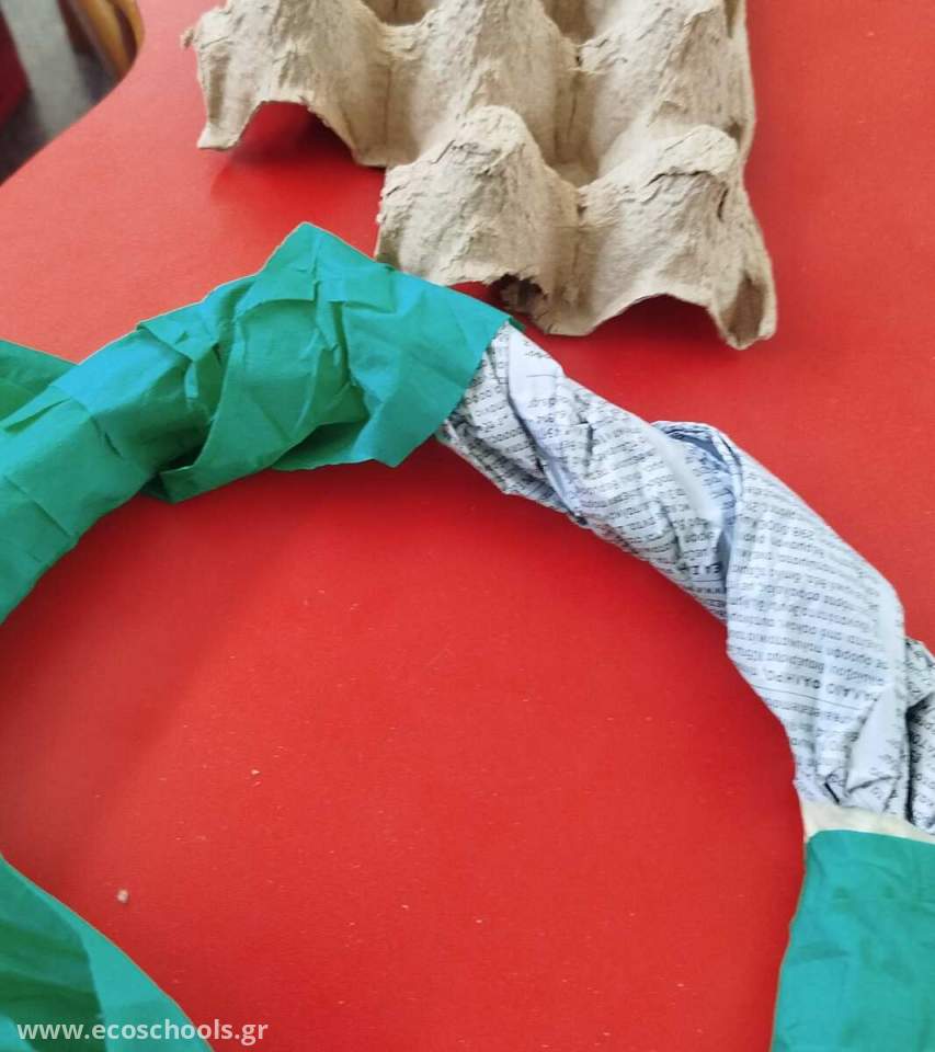 Αφού κόψαμε σε σχήμα λουλουδιών τις αυγοθήκες,τα βάψαμε και τα κολλήσαμε σε ένα στεφάνι φτιαγμένο με εφημερίδες!!