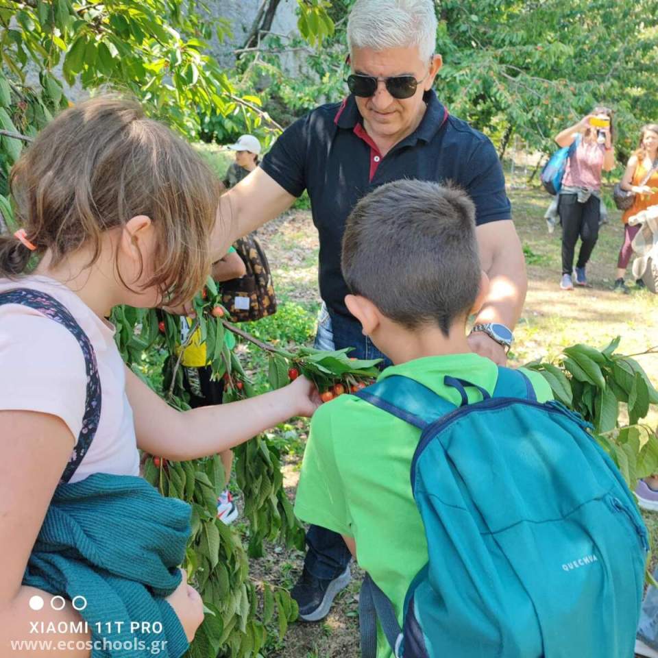 Πρώτος μας σταθμός ήταν ο Ιστορικός Κήπος της Παναγίας, ένα κτήμα με έτος ίδρυσης το 1810, γνωστό για τις βιολογικές του καλλιέργειες. Οι μαθητές ξεναγήθηκαν στον χώρο και ενημερώθηκαν από τον υπεύθυνο για την καλλιέργεια κερασιών και καρυδιών, την τεχνική της βιολογικής γεωργίας, καθώς και τη διαδικασία συγκομιδής. Στη συνέχεια, είχαν την ευκαιρία να μαζέψουν κεράσια οι ίδιοι και να απολαύσουν παραδοσιακά γλυκίσματα κάτω από τη σκιά ενός αιωνόβιου πλάτανου, σημείο αναφοράς του κτήματος, που έχει φιλοξενήσει στο παρελθόν προσωπικότητες από τον πολιτικό και θρησκευτικό χώρο.