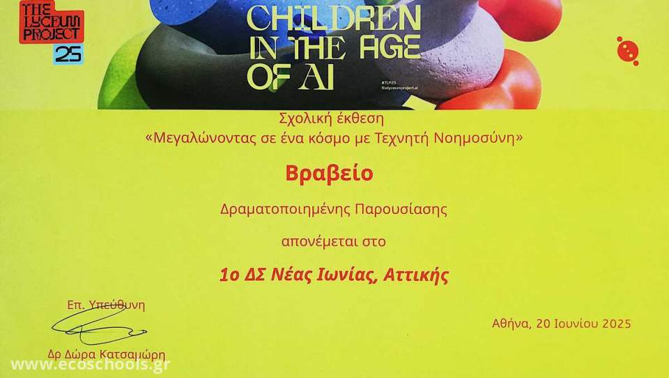 Η Σχολική Έκθεση «Μεγαλώνοντας σε έναν κόσμο με Τεχνητή Νοημοσύνη» αποτέλεσε μέρος μας μεγάλης εκδήλωσης που διοργανώθηκε από το The Lyceum Project και το ΕΚΕΦΕ Δημόκριτος στις αίθουσες του Ωδείου Αθηνών με τη συμμετοχή πολλών αξιόλογων ομιλητών από την Ελλάδα και το εξωτερικό.