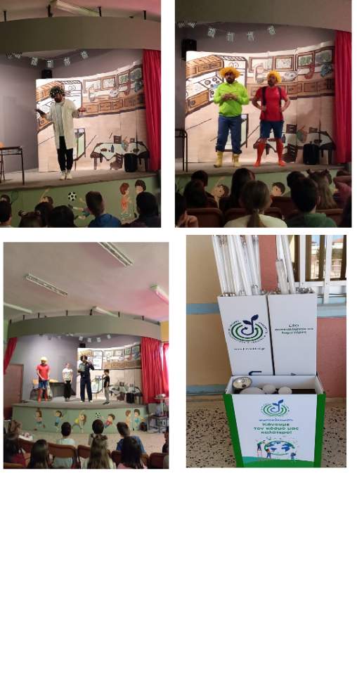 Μία νέα δράση Ανακύκλωσης Ηλεκτρικού και Ηλεκτρονικού εξοπλισμού με τίτλο « Φωτοκύκλωση » πραγματοποιήθηκε με μεγάλη επιτυχία στο σχολείο μας την Τετάρτη 3 Απριλίου με τη συμμετοχή των Τμημάτων Α1, Α2, Δ1, Δ2, Ε1 από την κ. Κυριακοπούλου Δήμητρα Διευθύντρια Μάρκετινγκ της Εταιρείας ΦΩΤΟΚΥΚΛΩΣΗ Α.Ε. με τα εξής στάδια :θεωρητική αναφορά, προβολή βίντεο εγκεκριμένου εκπαιδευτικού υλικού και θεατρικό δρώμενο , ώστε οι μαθητές/τριες να ευαισθητοποιηθούν στον σκοπό της ορθής απόρριψης και ανακύκλωσης του ανωτέρω εξοπλισμού προς όφελος του φυσικού περιβάλλοντος και της ανθρώπινης υγείας.