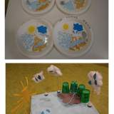 Έπειτα ασχοληθήκαμε με τον κύκλο του νερού. Με τη σταδιακή δημιουργία του κολλάζ σε μαγνητικό ή διαδραστικό πίνακα αντιληφθήκαμε καλύτερα πώς πραγματοποιείται αυτός ο κύκλος και ποιοι είναι οι επιστημονικοί όροι που χρησιμοποιούμε για να τον περιγράψουμε. Έπειτα χωριστήκαμε σε ομάδες και φτιάξαμε τις δικές μας συνθέσεις για να αποτυπώσουμε τη γνώση που πήραμε. Στο τέλος, κάναμε ατομικό κολλάζ σε χάρτινο πιάτο ή ομαδικό σε μακετόχαρτο.