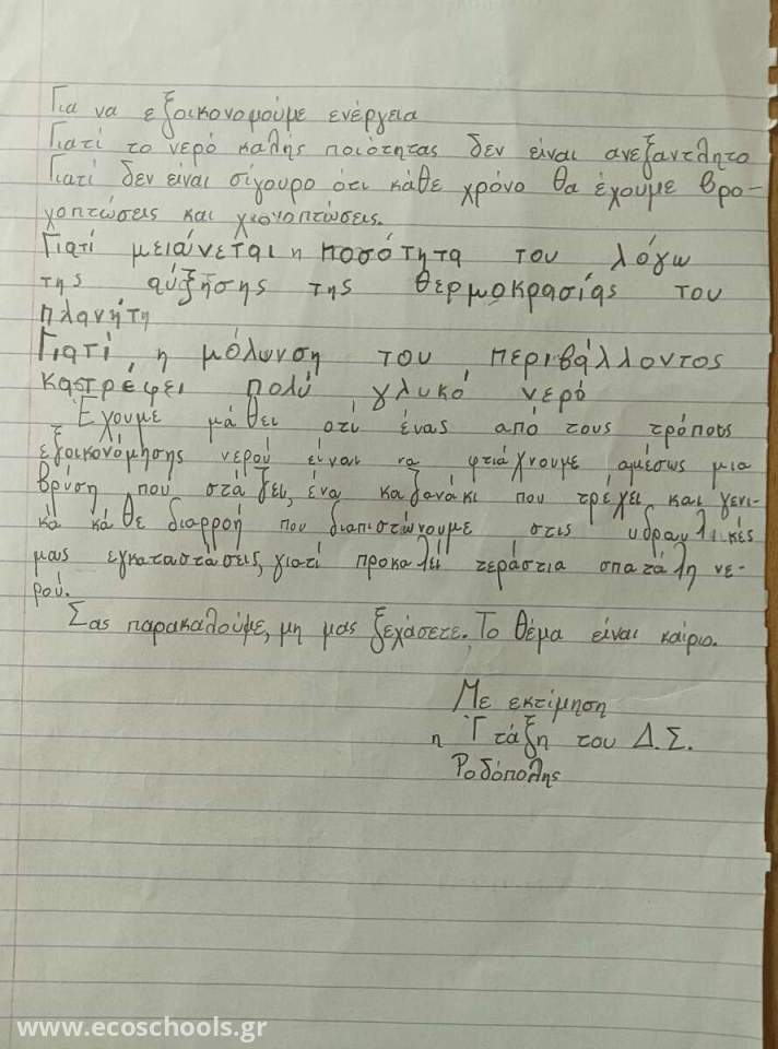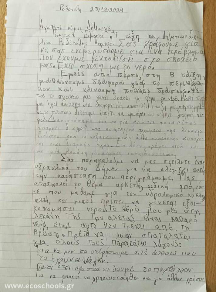 Τέλος αποφάσισαν μαζί με τη δασκάλα τους να γράψουν όλα τα προβλήματα και τις διαρροές σε μία κόλα χαρτί και να ζητήσουν από τον Δήμο μας να μας βοηθήσει να διορθώσουμε ότι δε λειτουργεί έτσι ώστε ούτε μία σταγόνα νερό να μην πάει χαμένη!