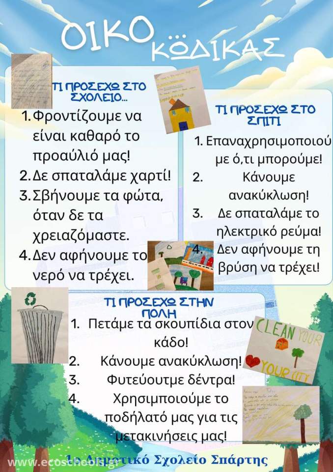 Με τη βοήθεια των μαθητών/ τριών του Δ'1 τμήματος του σχολείου μας δημιουργήσαμε τον οικο-κώδικα του σχολείου μας με σκοπό να ενημερωθούν όλοι οι μαθητές/ τριες του σχολείου μας αλλά ακόμη και οι επισκέπτες σε αυτό για τον τρόπο που πρέπει να συμπεριφερόμαστε στο σπίτι μας, στο σχολείο και στην πόλη μας για να προστατεύσουμε τον πλανήτη μας και να συμβάλλουμε όλοι στο να γίνει ο κόσμος μας καλύτερος!
