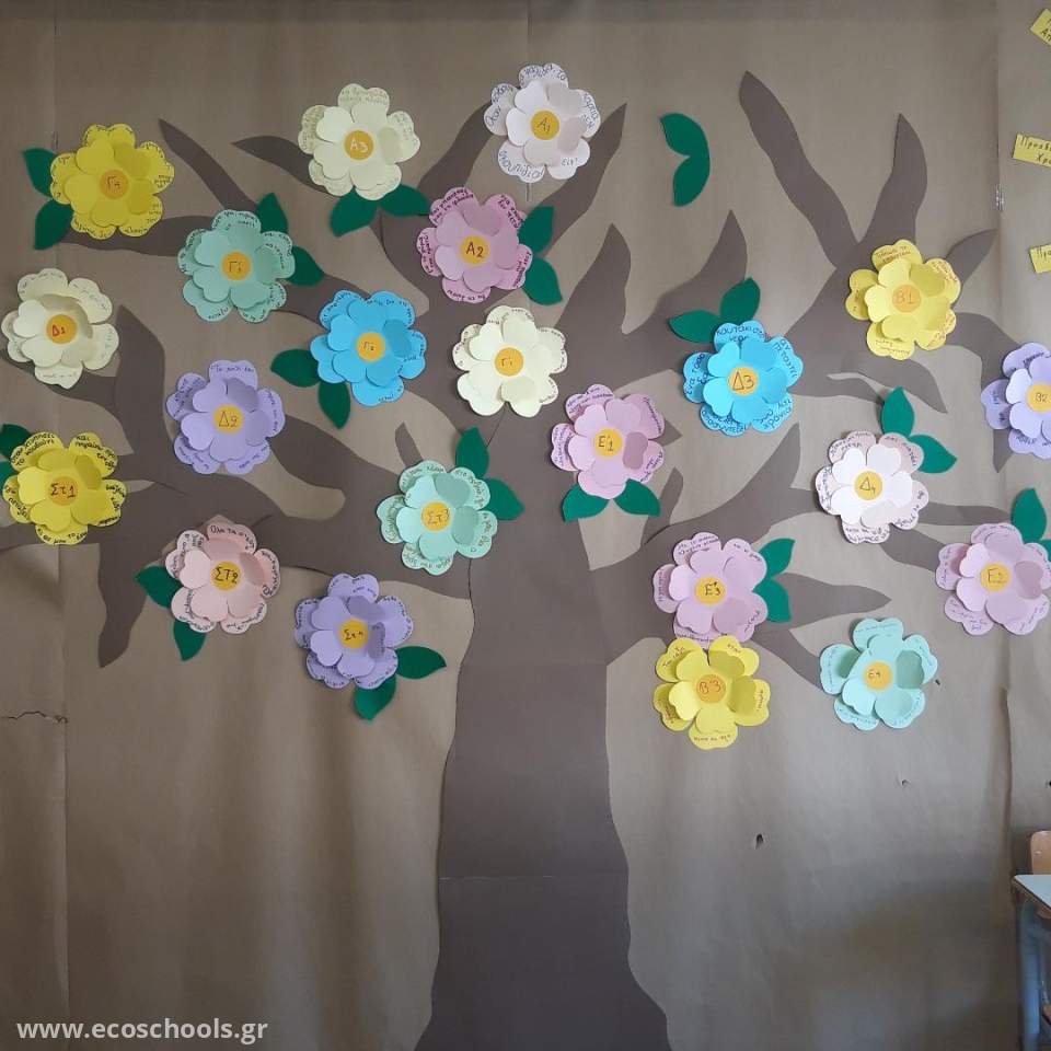 Αφού πλέον όλες οι τάξεις είχαν κάνεις τις δράσεις τους για τα «οικολογικά σχολεία», εμπνευστήκαμε και τον εκοκώδικα, ένα δέντρο με τόσα άνθη όσα και τα τμήματα του σχολείου και με ένα σύνθημα σε κάθε άνθος. Η δημιουργία μας κοσμεί τους διαδρόμους του σχολείου και το επόμενο βήμα είναι να τον μετατρέψουμε σε αφίσα.