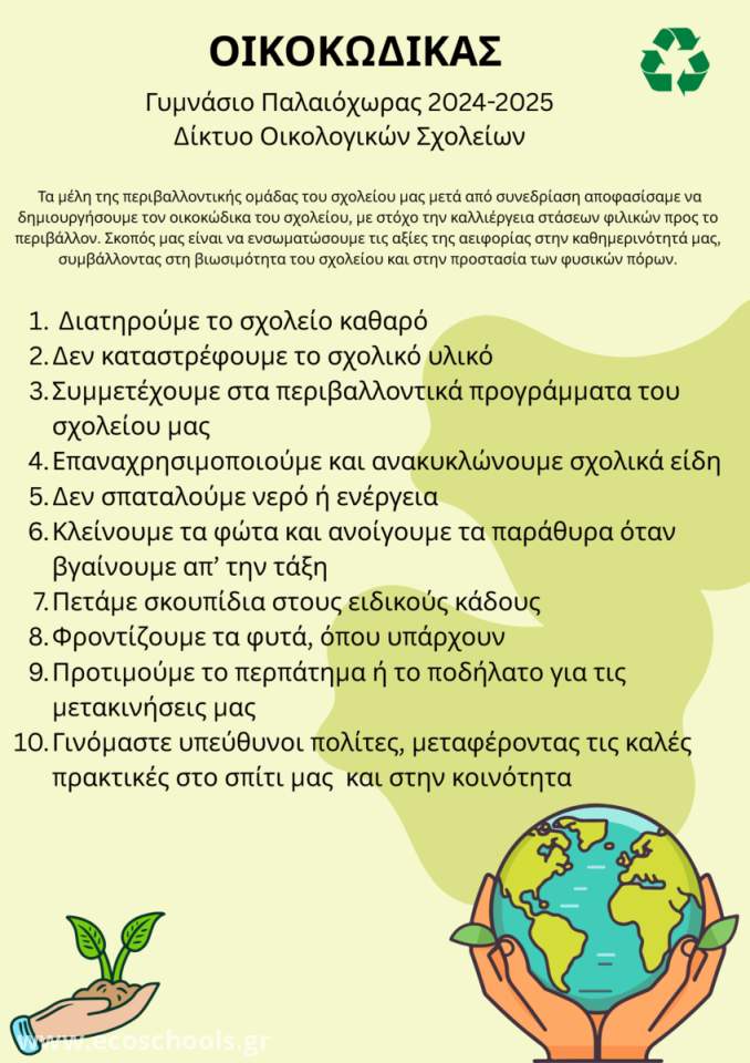 Φέτος, το σχολικό έτος 2024 - 2025, για πρώτη φορά ενταχθήκαμε στο Δίκτυο Οικολογικών Σχολείων και αυτό μας έδωσε μεγάλη χαρά και ώθηση για δουλειά. Ξεκινήσαμε με τη σύνταξη του Οικοκώδικα...., ο οποίος κοινοποιήθηκε σε όλους τους μαθητές και αναρτήθηκε σε όλες τις αίθουσες του σχολείου μας.