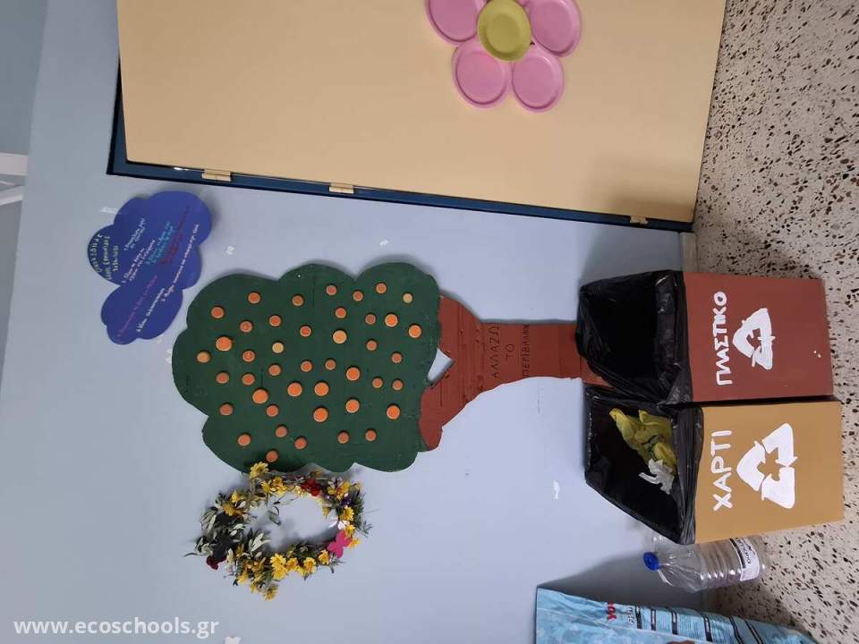 Σε ομαδικό κλίμα συνεργασίας οι μαθητές και οι εκπαιδευτικοί δημιούργησαν μια γωνιά ανακύκλωσης με τα δύο βασικά υλικά που χρησιμοποιούνται και ξοδεύονται στο σχολείο, χαρτί και πλαστικό. Χρησιμοποίηθηκαν ανακυκλώσιμα υλικά και η δράση ολοκληρώθηκε με δημιουργία οικοκώδικα που αφορούν τις περιβαλλοντικές μας κινήσεις εντός σχολείου.