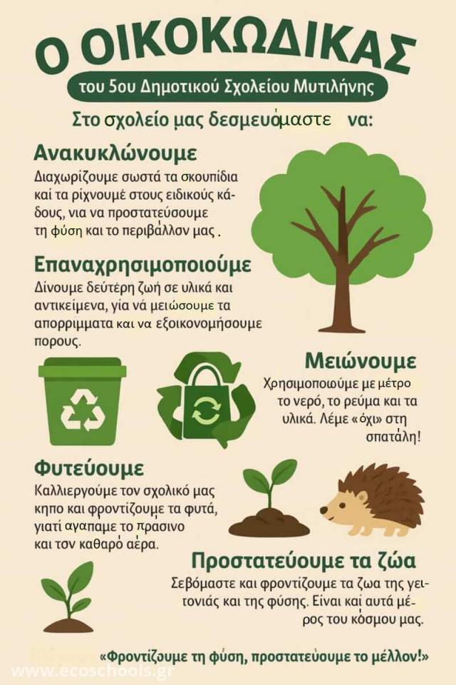 Στο πλαίσιο του Δικτύου Περιβαλλοντικής Εκπαίδευσης «Οικολογικά Σχολεία», οι μαθητές του σχολείου μας, μέσα από δημιουργική συνεργασία και διαλογική συζήτηση, διαμόρφωσαν τον Οικοκώδικα του σχολείου μας. Πρόκειται για μια ψηφιακή αφίσα με κανόνες οικολογικής συμπεριφοράς που προάγουν την αειφορία και τη βιώσιμη στάση ζωής. Οι μαθητές δεσμεύτηκαν ως «Προστάτες του Περιβάλλοντος» να εφαρμόζουν καθημερινά αυτές τις αρχές και να ενθαρρύνουν και τους άλλους να κάνουν το ίδιο.