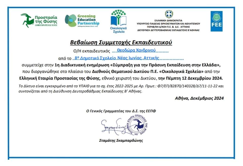Η 1η Διαδικτυακή επιμόρφωση στο πλαίσιο του Διεθνούς Θεματικού Δικτύου Περιβαλλοντικής Εκπαίδευσης «Οικολογικά Σχολεία» είχε τίτλο: «Σύμπραξη για την Πράσινη Εκπαίδευση στην Ελλάδα» και υλοποιήθηκε στις 12 Δεκεμβρίου 2024.