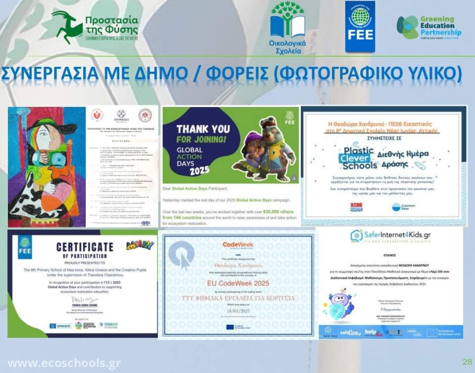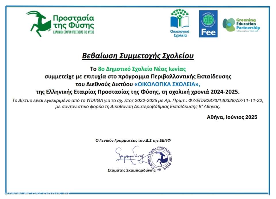 Το σχολικό έτος 2024-2025 στο 8º Δημοτικό Σχολείο Νέας Ιωνίας, Αττικής ολοκληρώθηκαν με επιτυχία πολλές δραστηριότητες και δράσεις. Το εκπαιδευτικό πρόγραμμα που υλοποιήθηκε κάλυψε όλες τις διδακτικές ενότητες που σχεδιάστηκαν και οι μαθητές και μαθήτριες είχαν ενεργή, βιωματική συμμετοχή από την αρχή έως την τελική παρουσίαση που κάναμε δια ζώσης και με ψηφιακά αρχεία που παραδόθηκαν. https://www.ecoschools.gr/school-news/2025/kainotomes-dimioyrgikes-syner...
