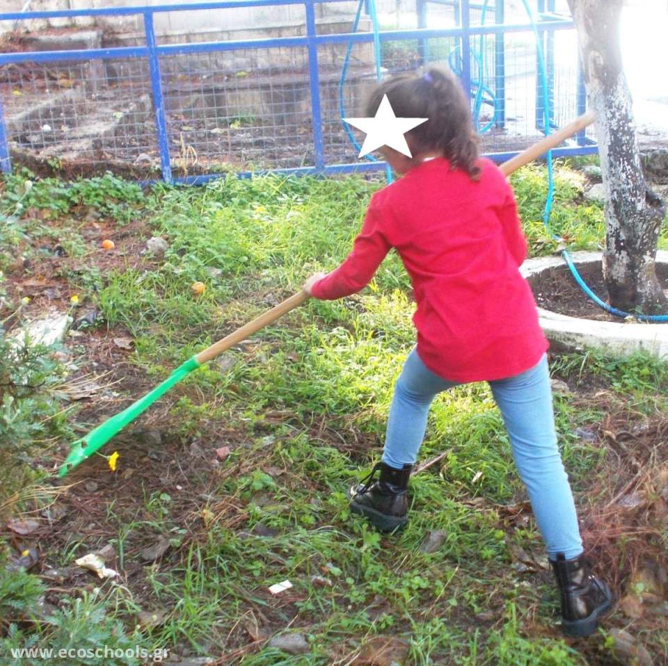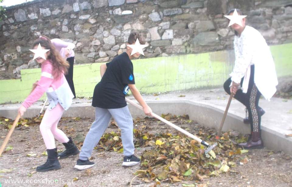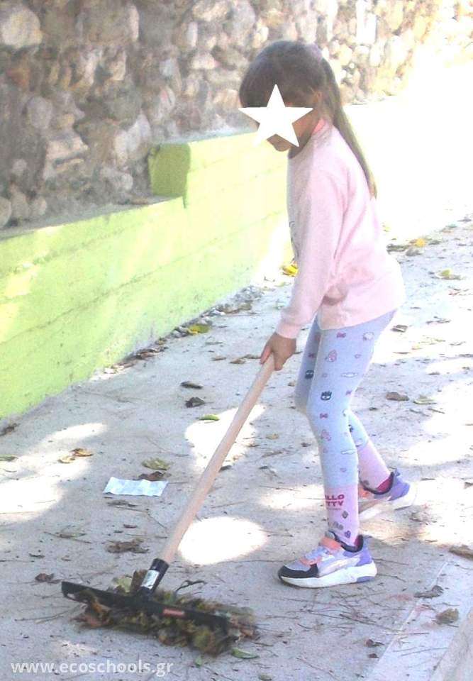 # Οι μεγάλες σχολικές αυλές με τα πολλά δέντρα, όπως η δική μας, απαιτούν καθάρισμα όλο το χρόνο. Διαρκής πονοκέφαλος είναι οι πευκοβελόνες που πρέπει να καθαρίζονται τακτικά, για λόγους πυρασφάλειας πρώτα -πρώτα). Πρόβλημα επίσης είναι και τα φύλλα από τα φυλλοβόλα δέντρα, ιδίως τις μουριές, που σχηματίζουν παχύ στρώμα στο έδαφος, όταν αρχίσουν να πέφτουν στα μέσα του φθινοπώρου.
