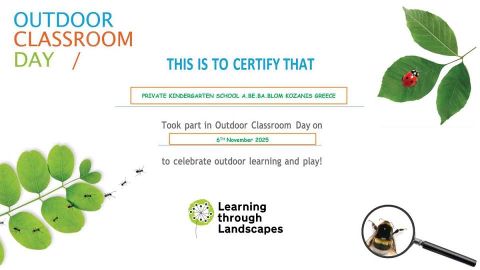 Φέτος το Ιδιωτικό Νηπιαγωγείο Α.μπε.μπα.μπλομ Κοζάνης στις 6 Νοεμβρίου συμμετείχε επίσημα στο Outdoor Classroom Day, μια παγκόσμια δράση που δείχνει πόσο σημαντικό είναι τα παιδιά να μαθαίνουν έξω, στη φύση. 🌳✨