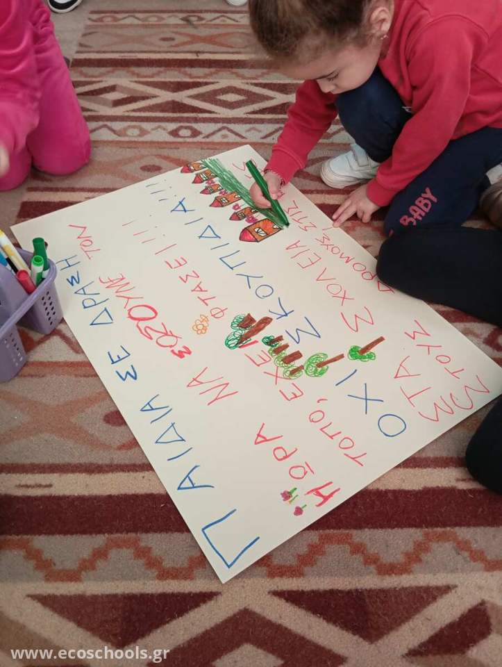 Τα παιδιά συνεχίζουν να φωτογραφίζουν την αυλή του Νηπιαγωγείου μας και τον ευρύτερο χώρο γύρω από αυτήν. Με λύπη διαπιστώνουν ότι, κάποιοι συνεχίζουν να πετούν σκουπίδια στις αυλές του Δημοτικού Σχολείου και του Νηπιαγωγείου. Αναλαμβάνουν Δράση. Δημιουργούν αφίσες και πλακάτ και αποφασίζουν να φωνάξουν, να μεταδώσουν το μήνυμα, για ένα καθαρό περιβάλλον παντού, στο Σχολείο, στην ευρύτερη τοπική κοινωνία, στον κόσμο όλο.