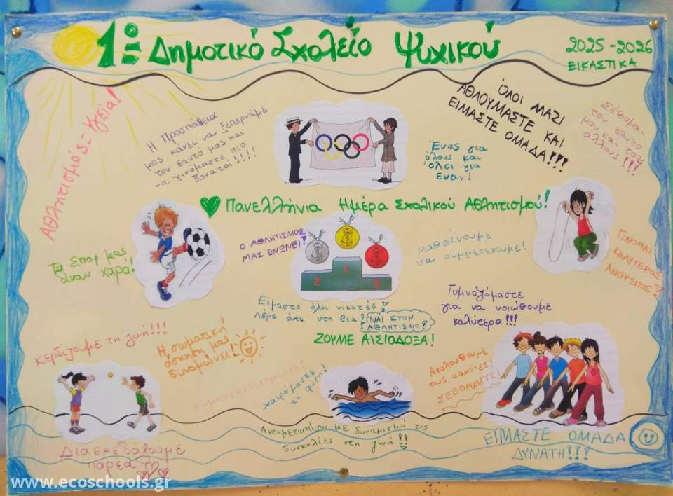 Στο 1º Δημοτικό Σχολείο Ψυχικού, το σχολικό έτος 2025-2026, η Τέχνη συνδέθηκε διαθεματικά με τον Αθλητισμό. Το Σχολείο μας, είναι προσανατολισμένο στην αειφόρο ανάπτυξη και την δημιουργία θετικού κλίματος ευημερίας, στοιχεία που προάγουν την μάθηση και την απόκτηση όμορφων εμπειριών.