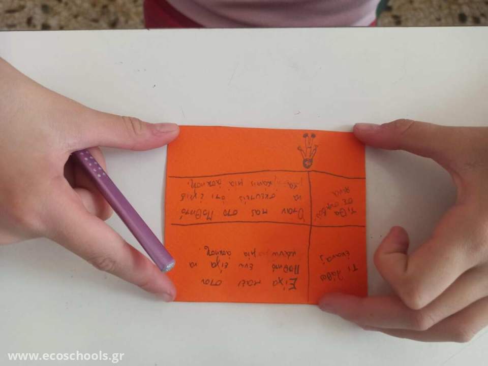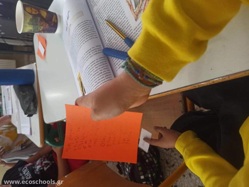 Στο πλαίσιο της ενότητας «Αναγνωρίζοντας και διορθώνοντας τα λάθη μας» από το μάθημα των Θρησκευτικών και με άξονα την ενίσχυση των Διαπροσωπικών Σχέσεων του προγράμματος των Οικολογικών Σχολείων υλοποιήθηκε στην Ε’ Δημοτικού η δράση «Πάρε τη συμβουλή μου!». Κάθε παιδί κλήθηκε να γράψει σε ένα χαρτονάκι ένα λάθος που έχει κάνει –είτε σε κάποιο μάθημα είτε σε μια δεξιότητα ή συμπεριφορά– και να διατυπώσει μια συμβουλή προς έναν συμμαθητή ή μια συμμαθήτρια, ώστε να τον βοηθήσει να το αποφύγει. Τα χαρτονάκια κυκλοφόρησαν στην τάξη και αποτέλεσαν μια αφορμή για διάλογο, αναστοχασμό και ενσυναίσθηση.