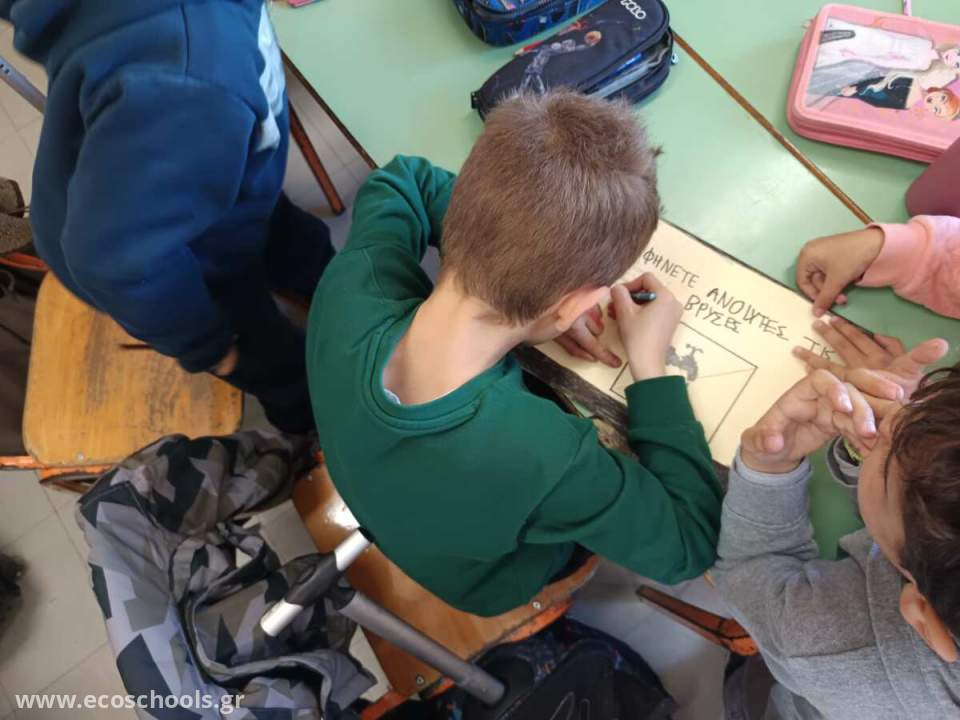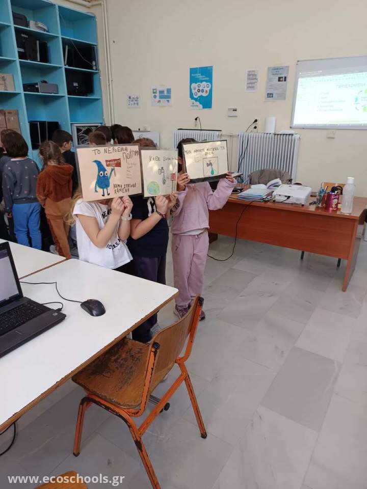 Οι μαθητές της Β΄ τάξης κάνοντας έρευνα διαπίστωσαν πως αρκετά συχνά οι βρύσες στις τουαλέτες του σχολείου μας , μένουν ανοιχτές!Οπότε ....ανέλαβαν δράση! Έφτιαξαν πινακίδες που αναδεικνύουν τη σπουδαιότητα του νερού και την αναγκαιότητα εξοικονόμησής του . Η Περιβαλλοντική Επιτροπή ανέλαβε να ενημερώσει για αυτές τον Διευθυντή, τους δασκάλους καθώς και τους μαθητές όλων των τμημάτων του σχολείου μας . Ζήτησαν τη βοήθειά τους και την υπόσχεσή τους πως καμιά βρύση δε θα μένει ανοιχτή . Οι πινακίδες αυτές θα κολληθούν πάνω από τις βρύσες , ώστε να υπενθυμίζουν πως <<Κάθε σταγόνα είναι πολύτιμη>> .