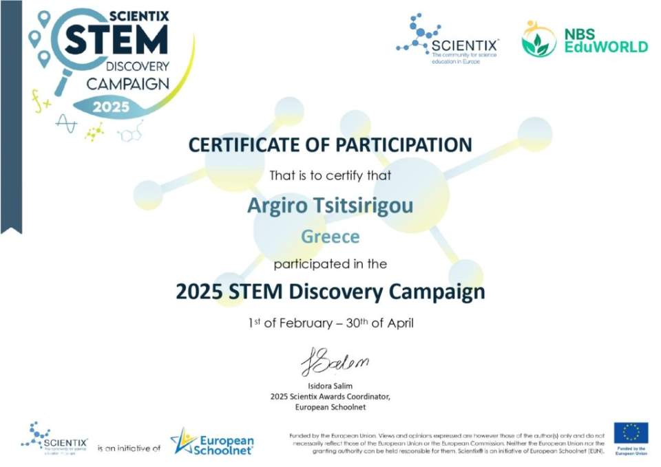 Παραλάβαμε με χαρά το Πιστοποιητικό Συμμετοχής μας στην STEM Discovery Campaign 2025, συνοδευόμενο από θερμά συγχαρητήρια από την ομάδα του Scientix EU για τη συμβολή μας στην επιτυχή ολοκλήρωση της εκστρατείας.