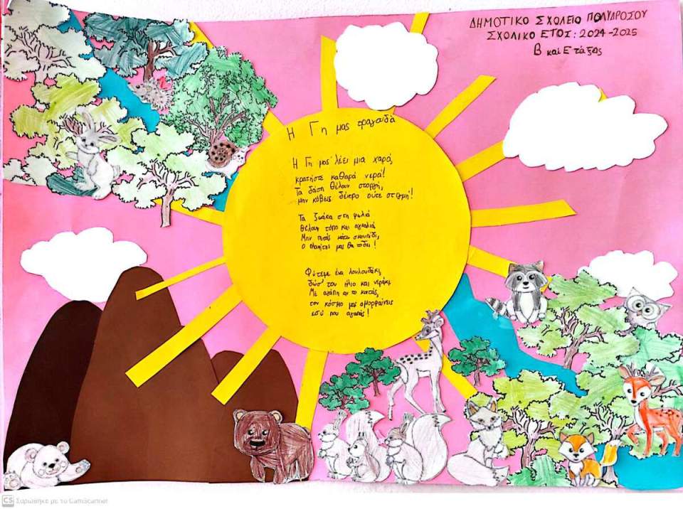 Οι μαθητές και οι μαθήτριες των Β’ και Ε’ τάξεων του σχολείου μας, με την καθοδήγηση των εκπαιδευτικών Μαριλένας Παπαπούλια και Κατερίνας Αναστασίου, ανταποκρίθηκαν με ενθουσιασμό στην πρόσκληση, δημιουργώντας ένα ποίημα αφιερωμένο στο περιβάλλον, αντλώντας έμπνευση και από το Περιβαλλοντικό Πρόγραμμα «Ο Κήπος της Ευθύνης: Μαθαίνουμε να Σεβόμαστε και να Δρούμε για το Περιβάλλον».