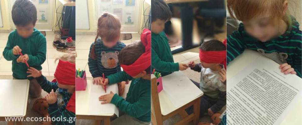 Οι μαθητές και οι μαθήτριες του Τ.Ε, με αφορμή την επίσκεψη της κ. Ιωάννας και του Μπάμπου, ήρθαν σε επαφή με τις οπτικές αναπηρίες. Παρατήρησαν το αλφάβητο στη Braille και βίωσαν δραστηριότητες από τη θέση των ατόμων με τύφλωση.