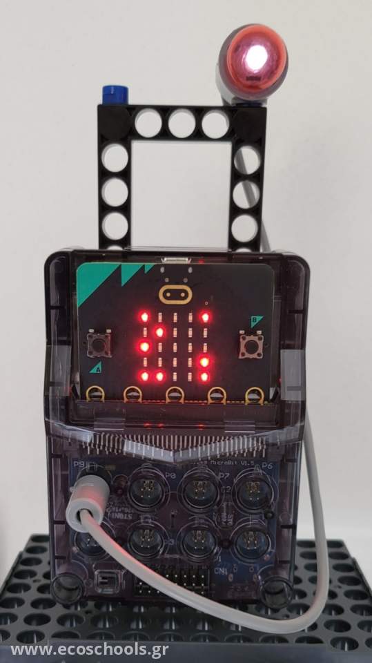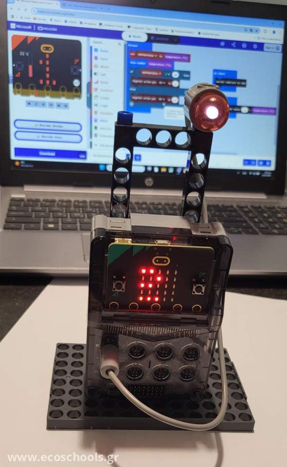 Επιπλέον κατασκεύασαν έναν θερμοστάτη χρησιμοποιώντας το micro:bit και το κιτ ρομποτικής GigoRobots. Προγραμμάτισαν το micro:bit να μετρά με τον αισθητήρα του τη θερμοκρασία του χώρου. Οι μετρήσεις αποτυπώνονται σε μια γραφική παράσταση για να παρακολουθήσουν τι γίνεται και κατά τη διάρκεια που το σχολείο είναι κλειστό. Κάθε φορά που η θερμοκρασία ξεπερνά τους 20ο C, τότε ένας κόκκινος λαμπτήρας ανάβει και προειδοποιεί τα παιδιά να κλείσουν τη θέρμανση. Ο κώδικας που δημιούργησαν τα παιδιά φαίνεται εδώ: https://makecode.microbit.org/_Xrx0auRCKFJ2