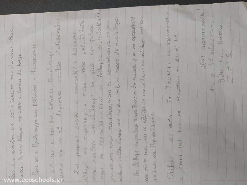 Αφού ενημερώθηκαν και συζήτησαν για τις επιπτώσεις της κλιματικής αλλαγής, τα παιδιά έγραψαν προσωπικές επιστολές προς τον Πρωθυπουργό της Ελλάδας, που θα εκπροσωπήσει τη χώρα μας στη Διάσκεψη, και τον Πρόεδρο της COP30.