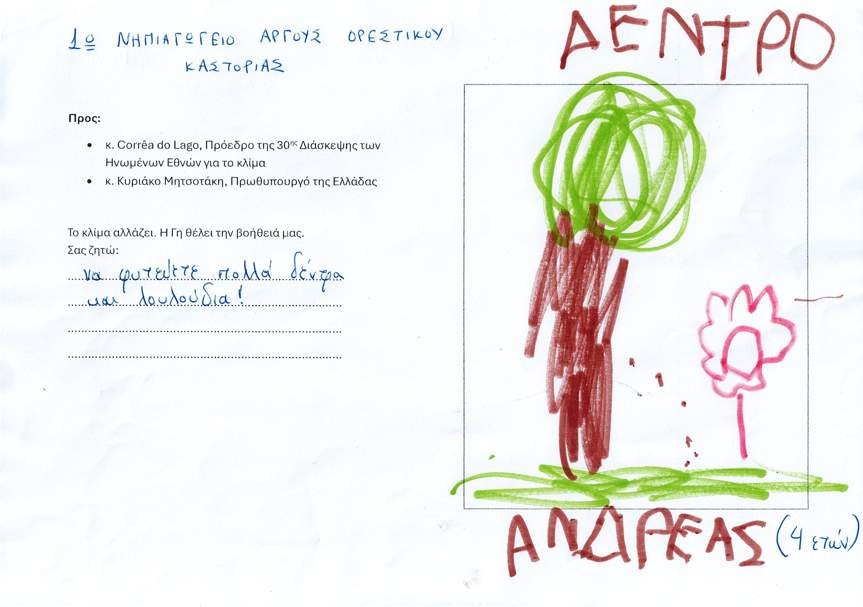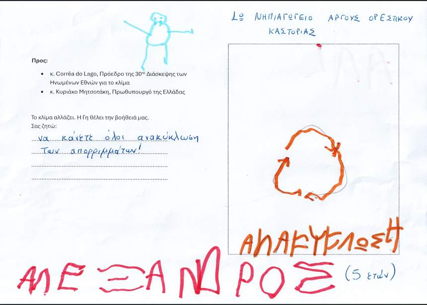 To 1o Νηπιαγωγείο Άργους Ορεστικού συμμετείχε στην κοινή δράση που υλοποιεί η Ελληνική Εταιρία Προστασίας της Φύσης με το WWF Ελλάς, σχετικά με την δημιουργία και αποστολή καρτών/επιστολών προς τους παγκόσμιους ηγέτες που συνεδριάζουν στην COP30 της Βραζιλίας, 10-21 Νοεμβρίου 2025.