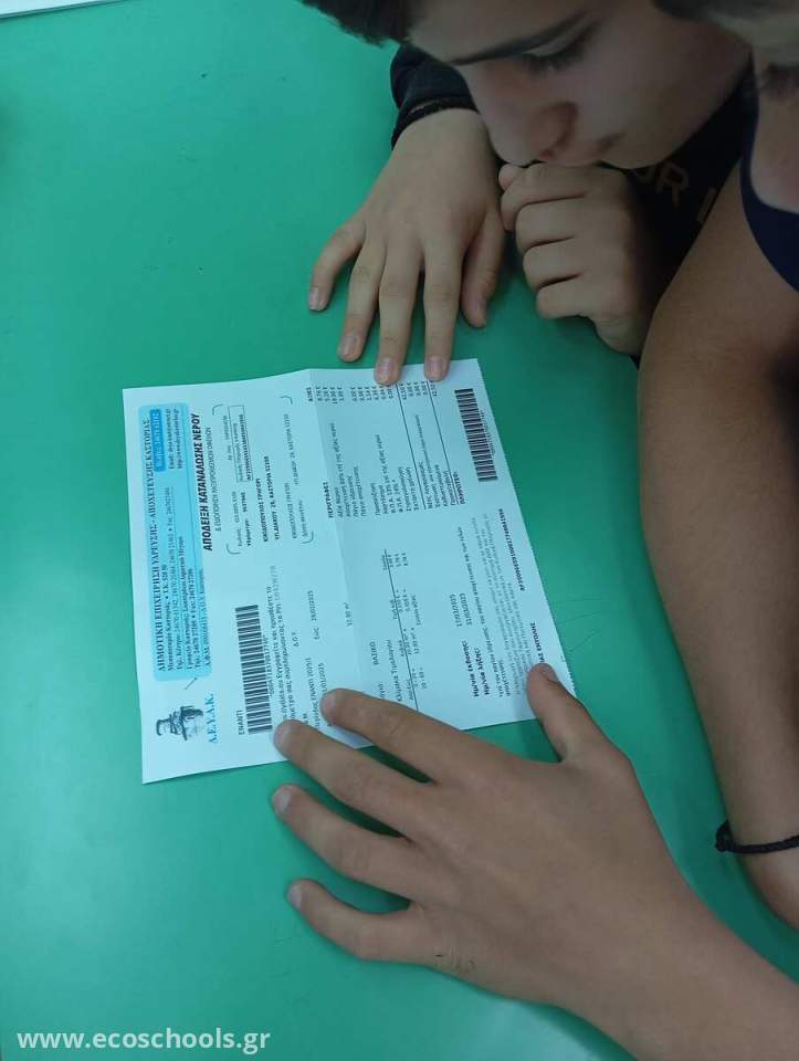 Στο πλαίσιο της ενότητας «Νερό», αξιοποιήθηκαν επιλεγμένες δραστηριότητες του προγράμματος, με σκοπό την ανάδειξη και εμβάθυνση του συγκεκριμένου ζητήματος, ενθαρρύνοντας τους μαθητές να αναγνωρίσουν τη σημασία της ορθής διαχείρισης των φυσικών πόρων και να υιοθετήσουν υπεύθυνες στάσεις και συμπεριφορές τόσο στο σχολικό όσο και στο οικογενειακό περιβάλλον. Αναλύσαμε έναν λογαριασμό νερού και παίξαμε ¨φιδάκι ¨ με αναφορά σε καλές και κακές πρακτικές αναφορικά με την χρήση του νερού