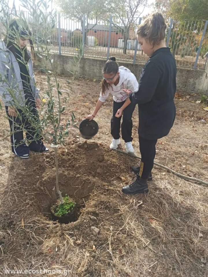 Ως συνέχεια των δράσεων μας για τη φύτευση δέντρων και την ενίσχυση του φυσικού περιβάλλοντος, συμμετείχαμε ενεργά στη διαμόρφωση του προαύλιου χώρου του νέου Καλλιτεχνικού Γυμνασίου της περιοχής μας. Με στόχο να δημιουργήσουμε έναν όμορφο και βιώσιμο σχολικό χώρο βοηθήσαμε στη φύτευση οπωροφόρων δέντρων και ελαιόδεντρων , συμβάλλοντας έτσι στη δημιουργία ενός οπωρώνα και ελαιώνα.