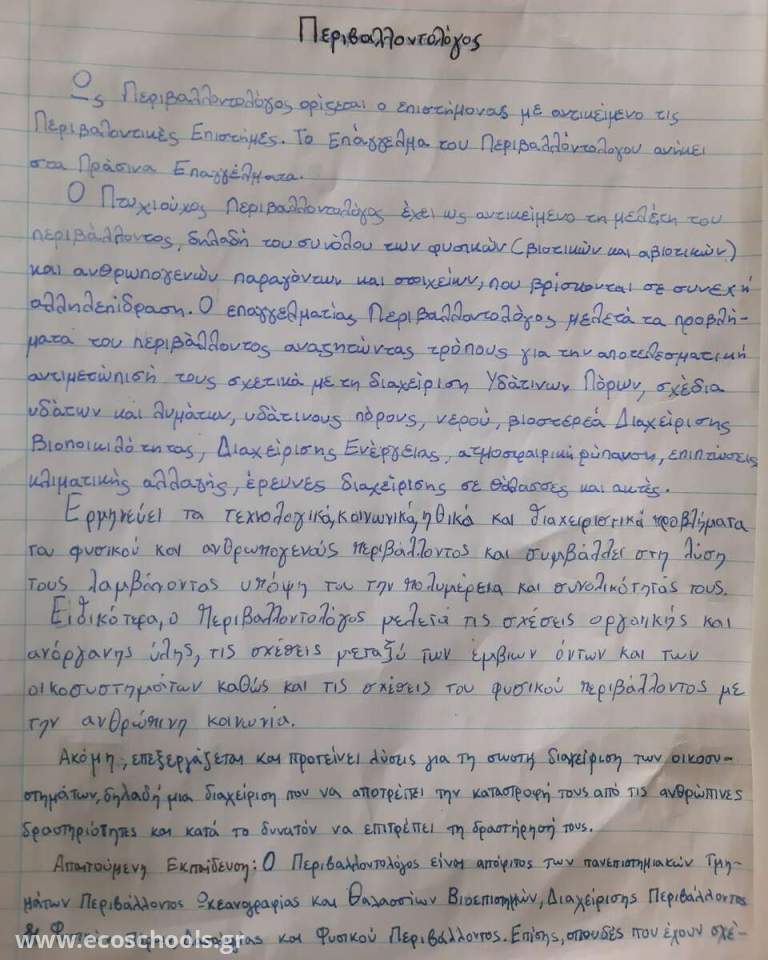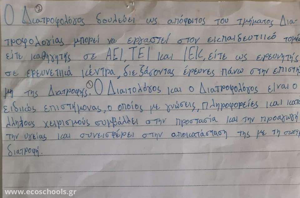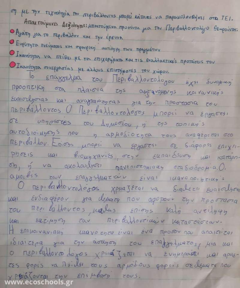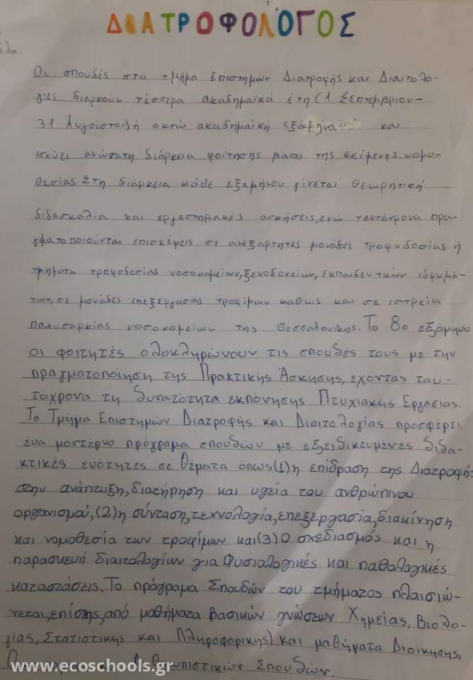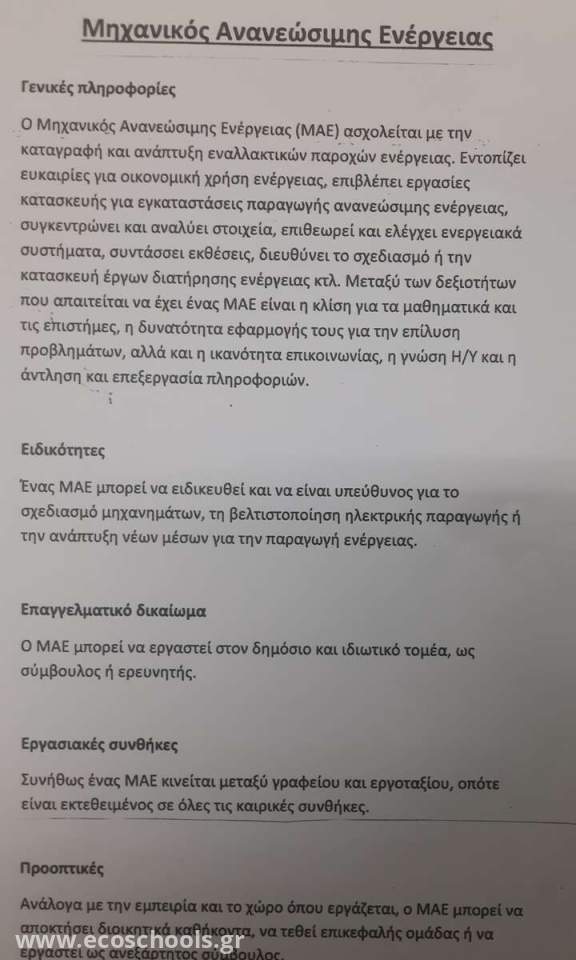 και μας παρουσίασαν τις εργασίες τους που αφορούν το επάγγελμα του περιβαλλοντολόγου, του μηχανικού ανανεώσιμης ενέργειας και του διατροφολόγου / διαιτολόγου.