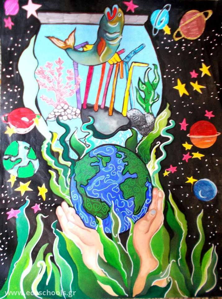@ Πρόκειται για ένα έργο διαστάσεων 50Χ70, (με ακρυλικά χρώματα και κολάζ). Το έργο απεικονίζει τα (τόσο πολύτιμα για το περιβάλλον) λιβάδια της Ποσειδωνίας, προβάλλοντας παράλληλα και τις δυσμενείς επιπτώσεις που τους δημιουργεί η αλόγιστη χρήση πλαστικών.