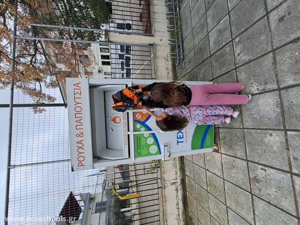 Επίσης, η δράση τους περιλάμβανε και την ανακύκλωση ρούχων και παπουτσιών. Τα παιδιά, μαζί με τους δασκάλους, συγκέντρωσαν παλιά ρούχα και παπούτσια και τα έβαλαν σε έναν ειδικό κάδο έξω από το σχολείο. Αυτά τα ρούχα και τα παπούτσια θα δοθούν σε οργανώσεις ή θα ανακυκλωθούν, δίνοντας ευκαιρία σε άλλα παιδιά να τα χρησιμοποιήσουν ξανά και προστατεύοντας το περιβάλλον μας.