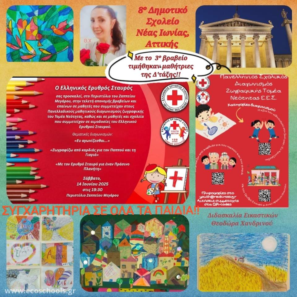 *Συμμετείχαμε ενεργά και ενώσαμε τις δημιουργικές μας προτάσεις, με Σχολεία από όλη την Ελλάδα, μέσα από τους Πανελλαδικούς μαθητικούς διαγωνισμούς  του “Ελληνικού Ερυθρού Σταυρού” για το σχολικό έτος 2024-2025. Οι ζωγραφιές υλοποιήθηκαν στο μάθημα των Εικαστικών και τα παιδιά είχαν μία βιωματική, ολιστική εμπειρία μάθησης, με διαθεματική προσέγγιση και με σεβασμό στην συμπερίληψη. Το 3º Βραβείο που κέρδισαν οι μαθήτριές μας της Δ΄' τάξης, μας έκαναν υπερήφανους. Το Σάββατο 14 Ιουνίου 2025 και ώρα 19:30 στο Ζάππειο Μέγαρο, ο Ελληνικός Ερυθρός Σταυρός υλοποίησε μία λαμπρή  εκδήλωση βράβευσης των συμμετεχόντων!