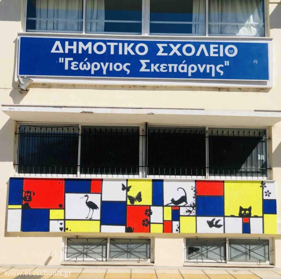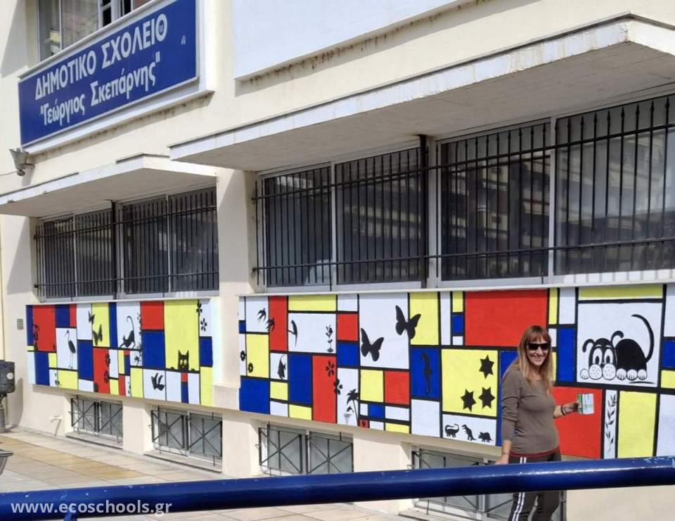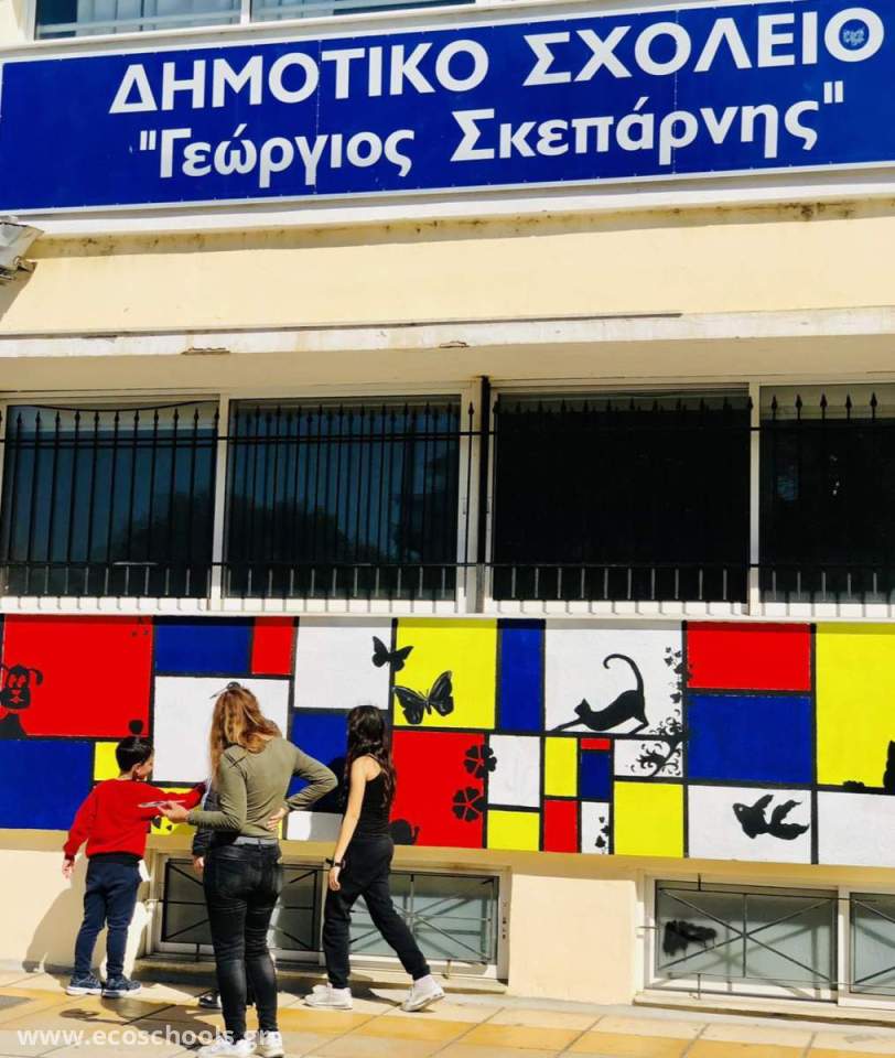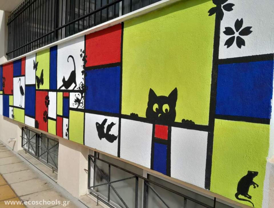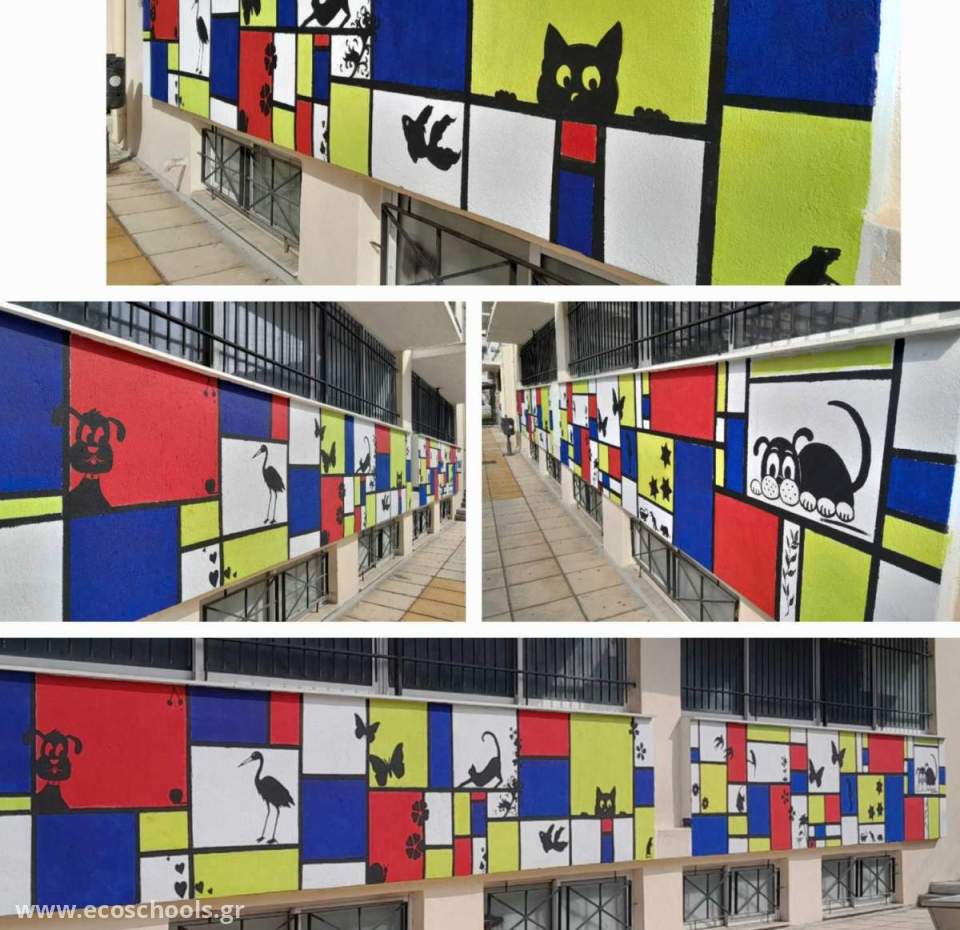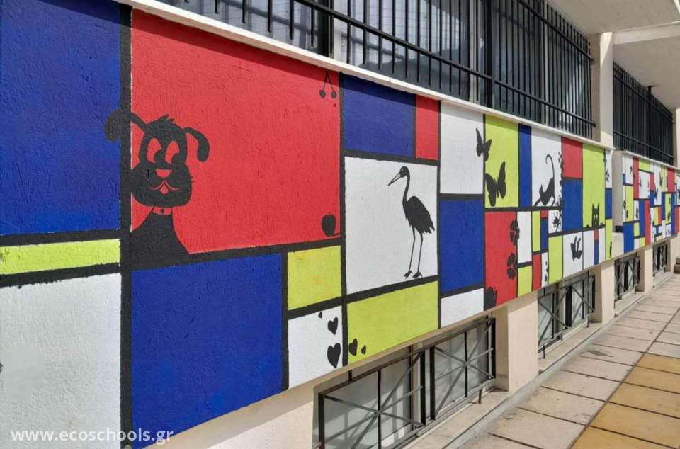 Η τέχνη μαζί με εικόνες από το φυσικό περιβάλλον βρίσκονται σε αρμονία στην αυλή του σχολείου μας. Με αφορμή το έργο του Μοντριάν αλλά και με πρόσθετα στοιχεία ζώων , φυτών και πολύ φαντασία ζωγραφίσαμε την πρόσοψη του κτηρίου στην αυλή του σχολείου μας. Η εικαστικός του σχολείου μας Βασιλική Σιώτη με την βοήθεια εκπαιδευτικών και μαθητών δούλεψαν με κέφι και χάρηκαν τόσο την διαδικασία όσο και το αποτέλεσμα, αναθμιζοντας αισθητικά το σχολειο με χρώματα και εικόνες, στέλνοντας ένα μήνυμα χαράς και αισιοδοξίας στην σχολική κοινότητα, στους περαστικούς και στους κατοίκους της γειτονιάς .