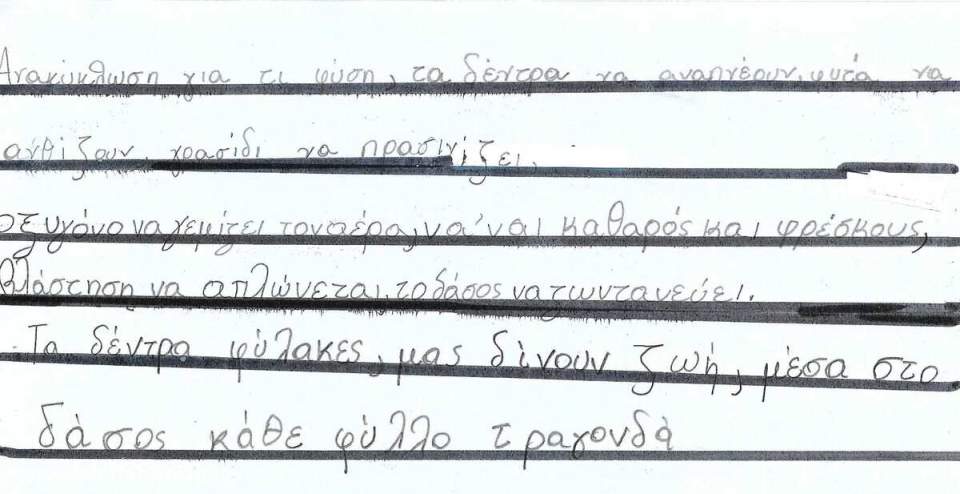 Την Πέμπτη, 13 Μαρτίου 2025, οι μαθητές του Ε΄2 τμήματος υλοποίησαν μέσα στην τάξη μία δράση σχετική με το φυσικό περιβάλλον και τα δέντρα της σχολικής αυλής μας, ως πολύτιμους φύλακες του κλίματος. Χωρίστηκαν σε 5 ομάδες και τα μέλη καθεμίας, αφού πρώτα κατέγραψαν λέξεις σχετικές με την οικολογία, το φυσικό περιβάλλον και τα δέντρα, χρησιμοποίησαν το ψηφιακό εργαλείο τεχνητής νοημοσύνης “ChatGPT”, το οποίο, με τις κατάλληλες οδηγίες που του έδιναν τα παιδιά, μαζί με τις δικές τους λέξεις – κλειδιά, «δημιουργούσε» ένα ποίημα κάθε φορά. Ακολούθως, τα μέλη κάθε ομάδας αντέγραψαν το ποίημά τους σε χαρτί Α4 και ζωγράφισαν σε άλλο χαρτί ό,τι συνέλαβαν στον νου τους με βάση το περιεχόμενο του ποιήματος.