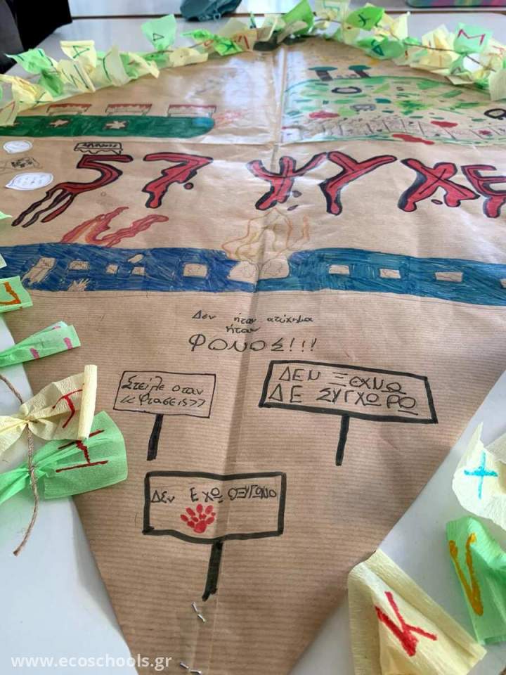 Στο πλαίσιο αυτής της ευαίσθητης μάθησης, τα παιδιά δημιούργησαν έναν ιδιαίτερο χαρταετό για τα Κούλουμα, αφιερωμένο στις 57 ψυχές που χάθηκαν, ως μια συμβολική πράξη μνήμης και έκφρασης ελπίδας. Μέσα από την καλλιτεχνική αυτή δημιουργία, οι μαθητές και οι μαθήτριες βίωσαν τον ρόλο της τέχνης ως μέσο επικοινωνίας βαθιών συναισθημάτων και κοινωνικής ευθύνης. Η βιωματική αυτή εμπειρία καλλιέργησε την ενσυναίσθηση, την κριτική σκέψη και το αίσθημα συλλογικής ευθύνης, δείχνοντας ότι η εκπαίδευση οφείλει να συμβάλλει στην ευαισθητοποίηση των νέων για τα σημαντικά ζητήματα που αφορούν την κοινωνία και την ιστορία μας.