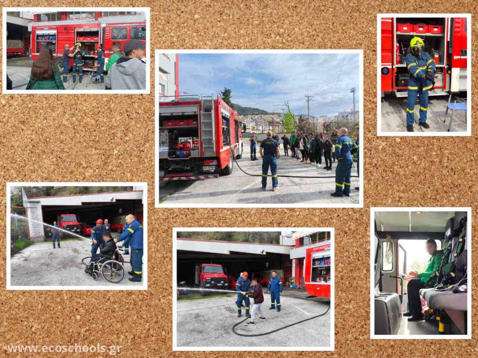 Στην Πυροσβεστική Υπηρεσία Καβάλας, μας υποδέχθηκε μια ομάδα πυροσβεστών, η οποία ενημέρωσε τους μαθητές και τις μαθήτριες για τις πιθανότερες αιτίες πρόκλησης φωτιάς στο σπίτι και στην εξοχή και τους/τις εξήγησε τους τρόπους αντιμετώπισης και διαχείρισης μιας εστίας πυρκαγιάς, μέχρι να έρθει η πυροσβεστική. Επιπλέον, έκαναν επίδειξη του εξοπλισμού, της ειδικής στολής καταστολής και των εργαλείων απεγκλωβισμού σε περίπτωση αυτοκινητικού ατυχήματος. Τέλος, ο κάθε μαθητής/μαθήτρια έριξε νερό από τη μάνικα και ανέβηκε στο πυροσβεστικό όχημα.