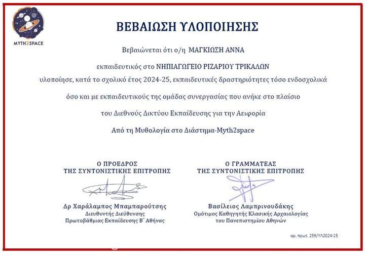Βεβαίωση συμμετοχής και υλοποίησης της δράσης " Μyth 2 Space"