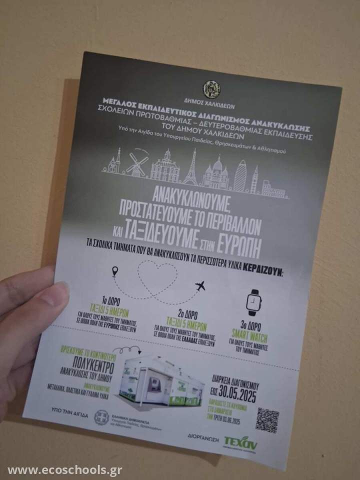Σαν κορύφωση όλων αυτών ο Δήμος Χαλκίδας σε συνεργασία με την Πρωτοβάθμια Εκπαίδευση και την Αιγίδα του Υπουργείου Παιδείας διοργάνωσε διαγωνισμό ΑΝΑΚΥΚΛΩΣΗΣ για όλες τις σχολικές μονάδες με έπαθλο πολλά δώρα. Το σχολείο μας αποφάσισε να συμμετέχει στο διαγωνισμό με σκοπό την συγκέντρωση όσων περισσότερών πλαστικών μπορεί. Σε αυτήν τη προσπάθεια σημαντική στάθηκε και η συμβολή του συλλόγου γονέων και κηδεμόνων.