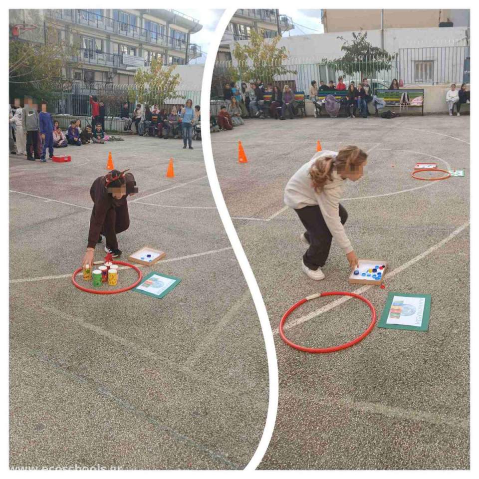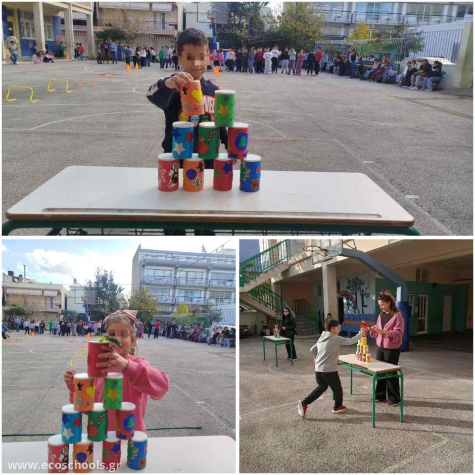 Οι μαθητές, χωρισμένοι σε τάξεις, συμμετείχαν σε μια διαδρομή με σταθμούς, κατά την οποία μετέφεραν καπάκια και τα τοποθετούσαν στο κουτί της ανακύκλωσης, ξεπέρασαν κινητικά εμπόδια, έχτισαν μια χριστουγεννιάτικη πυραμίδα και στο τέλος την αποδόμησαν.
