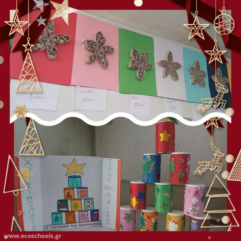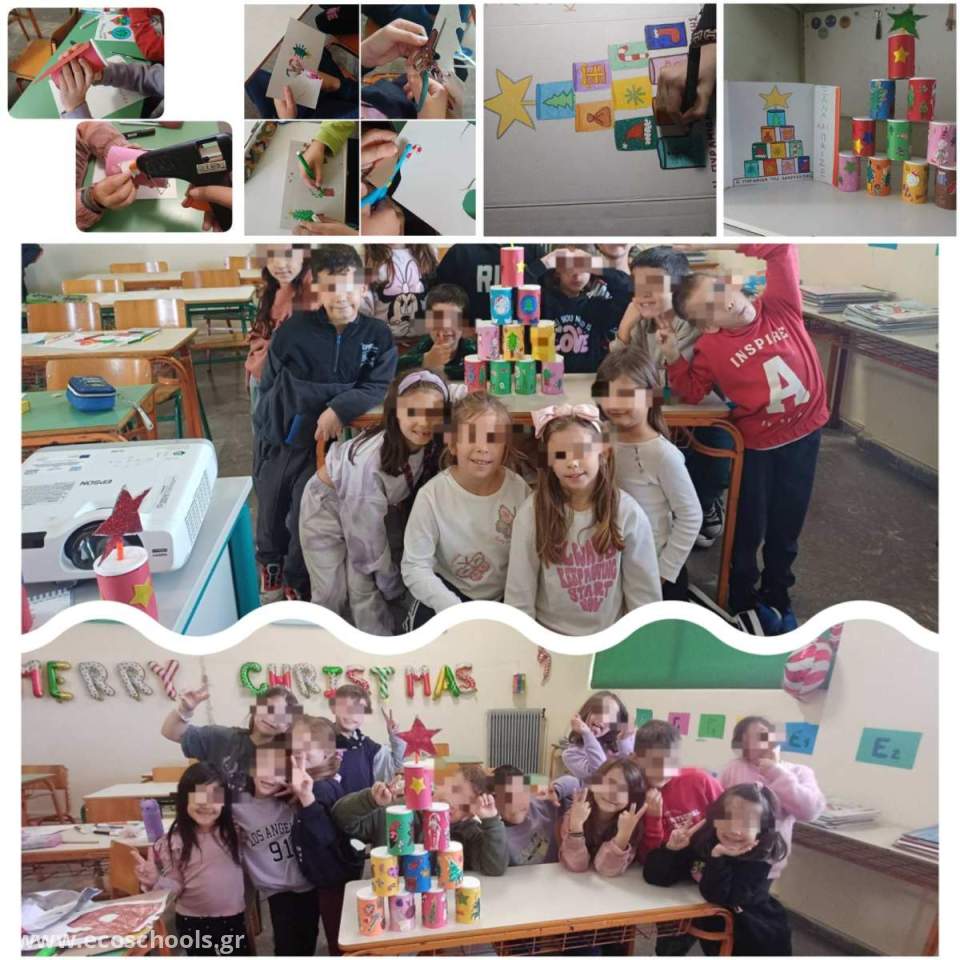 Στο πλαίσιο της ίδιας δράσης, οι μαθητές και οι μαθήτριες της Α΄ τάξης κατασκεύασαν χριστουγεννιάτικες κάρτες με ρολά από χαρτί υγείας. Μέσα από τη δημιουργική αυτή διαδικασία, τα παιδιά έστειλαν τις χριστουγεννιάτικες ευχές τους, μεταφέροντας παράλληλα ένα σημαντικό μήνυμα περιβαλλοντικής ευαισθητοποίησης.