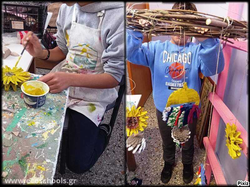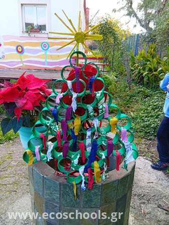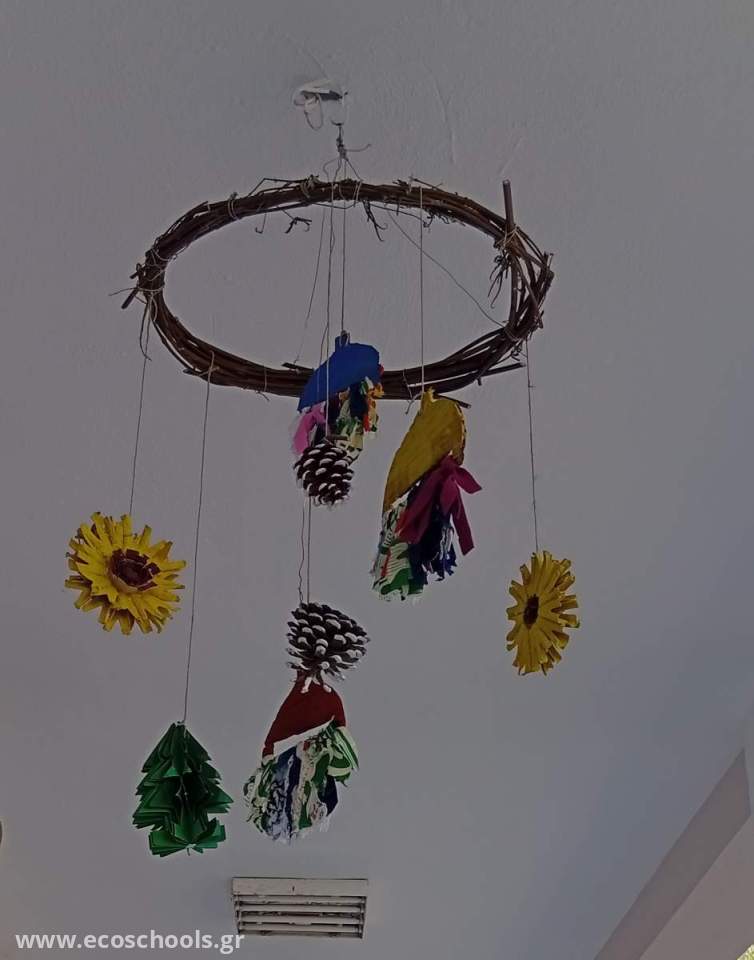 Στα πλαίσια της δράσης "δημιουργικά διαλείμματα" και κατά τη συμμετοχή των μαθητών στο "Εικαστικό εργαστήρι" υπό την εποπτεία και τον συντονισμό της Διευθύντριας του σχολείου, οι μαθητές δημιουργούς χριστουγεννιάτικες κατασκευές για τον στολισμό του σχολείου. Χρησιμοποιούν ανακυκλώσιμα υλικά σε ένα μαγικό πάντρεμα με υλικά της φύσης.