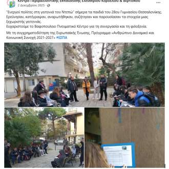 Στις 2 Δεκεμβρίου 2025, οι μαθητές/τριες ενός τμήματος της Β’ Τάξης του Γυμνασίου μας πραγματοποίησαν μια εξαιρετικά ενδιαφέρουσα διδακτική επίσκεψη στην περιοχή του Ντεπώ, συμμετέχοντας στο πρόγραμμα του ΚΕΠΕΑ Ελευθέριου Κορδελιού & Βερτίσκου «Ενεργός πολίτης στη γειτονιά μου». Η δράση αυτή, που εντάχθηκε στο πλαίσιο του μαθήματος «Ενεργός Πολίτης» και των «Εργαστηρίων Δεξιοτήτων», έδωσε την ευκαιρία στους/στις μαθητές/τριες να βγουν από τα όρια της σχολικής αίθουσας και να εξερευνήσουν το αστικό περιβάλλον με μια νέα, κριτική ματιά.