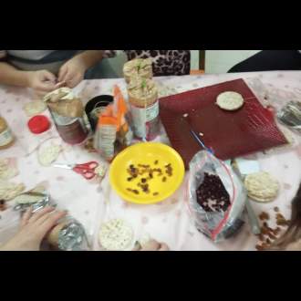Αρχίσαμε να δημιουργούμε με τα υλικά αυτά μικρές λιχουδιές, τις οποίες θα κρεμούσαμε στα δεντράκια της αυλής του Νηπιαγωγείου. Λιχουδιές για τα μικρά ζωάκια και τα πουλιά, που καθημερινά επισκέπονται την αυλή μας.