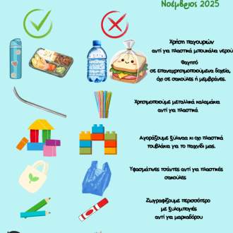 Στο Νηπιαγωγείο μας θα υλοποιήσουμε ένα σχέδιο δράσης για τη μείωση των πλαστικών αποβλήτων. Τα παιδιά θα μάθουν μέσα από την πράξη να προστατεύουν το περιβάλλον, χρησιμοποιώντας παγουρίνο αντί για πλαστικά μπουκάλια και επαναχρησιμοποιούμενα δοχεία για το φαγητό τους.