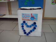 Φτιάξαμε  με χαρτόκουτο κάδο ανακύκλωσης, στον οποίο θα μαζέυουμε καπάκια μπουκαλιών , τα οποία στη συνέχεια θα χρησιμοποιηθούν για την κατασκευή αναπηρικών αμαξιδίων.